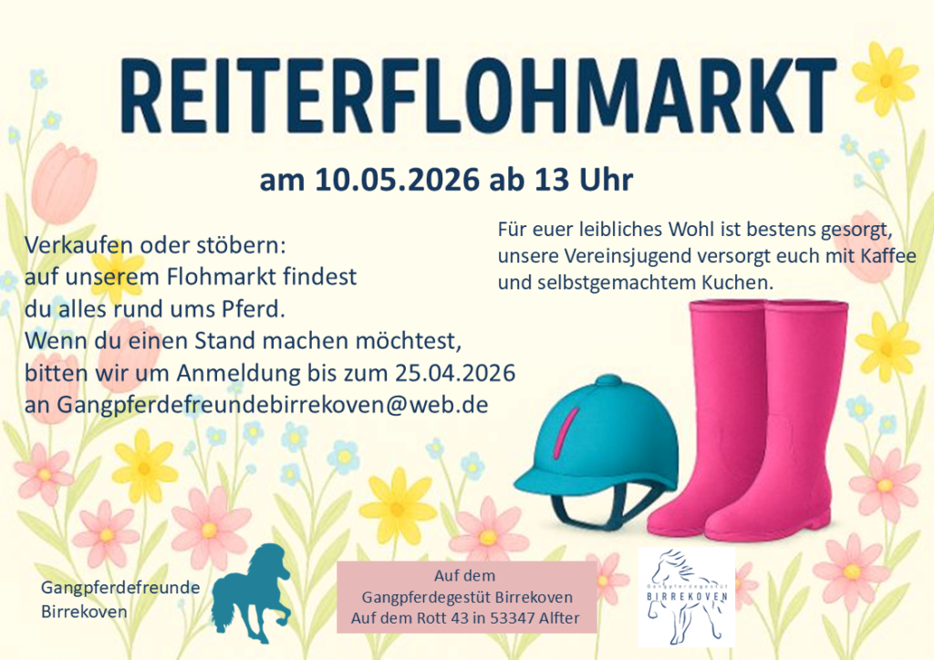 die Gangpferdefreunde Birrekoven e.V. veranstalten am Sonntag den 10. Mai einen Pferde- und Reiterflohmarkt auf dem Gangpferdegestüt Birrekoven. Beginn ist 13 Uhr.